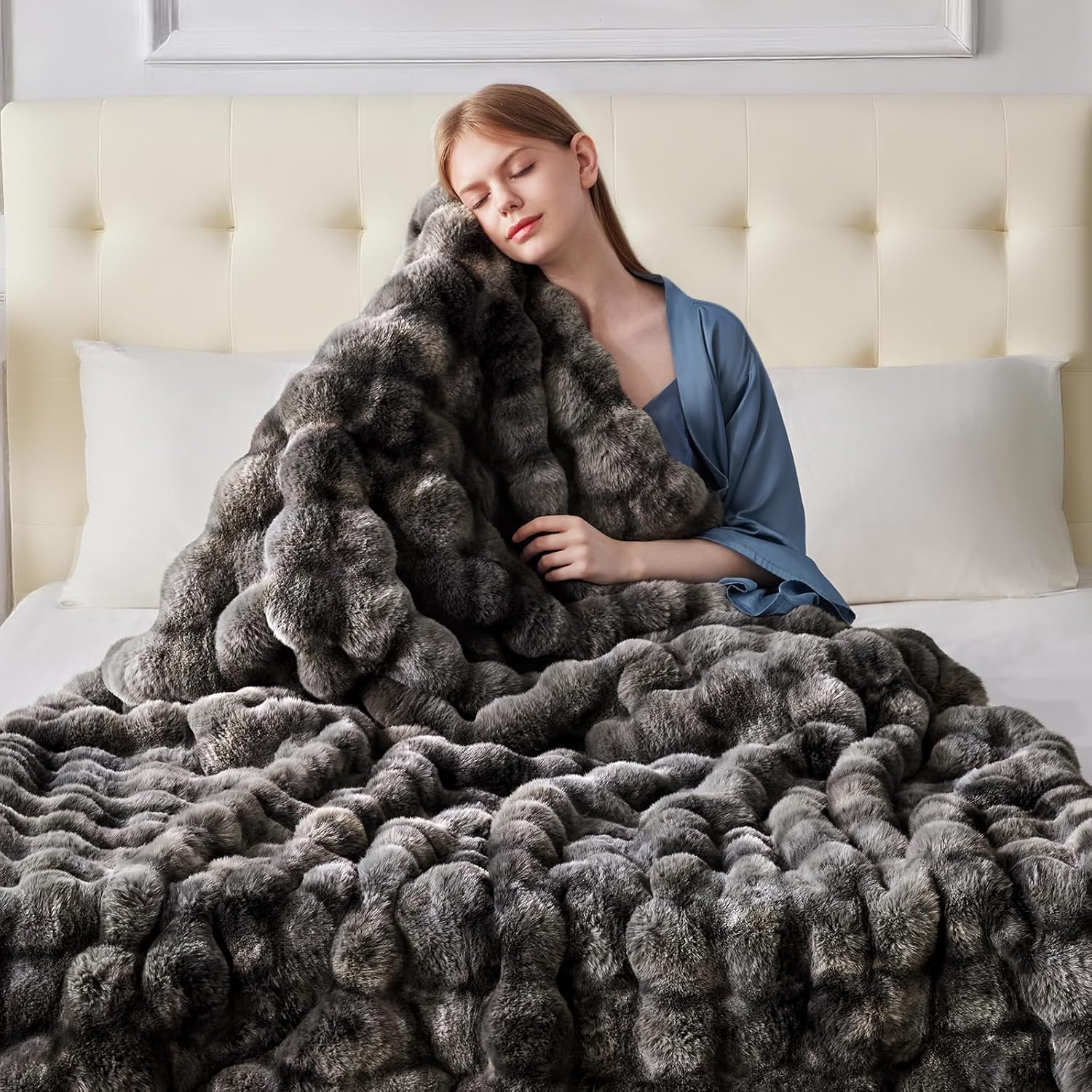 • UNMATCHED COMFORT WITH OUR FAUX FUR THROW BLANKET- Wrap yourself in luxury with this bubble fluffy blanket. Made from ultra-soft 700 GSM faux rabbit fur and 300GSM facecloth, this blanket offers cozy comfort on both sides. Its perfect fabric balance provides warmth without overheating, making it ideal for cold moments when relaxation is a must.NOTE - This blanket is a regular thick blanket, not a heated blanket