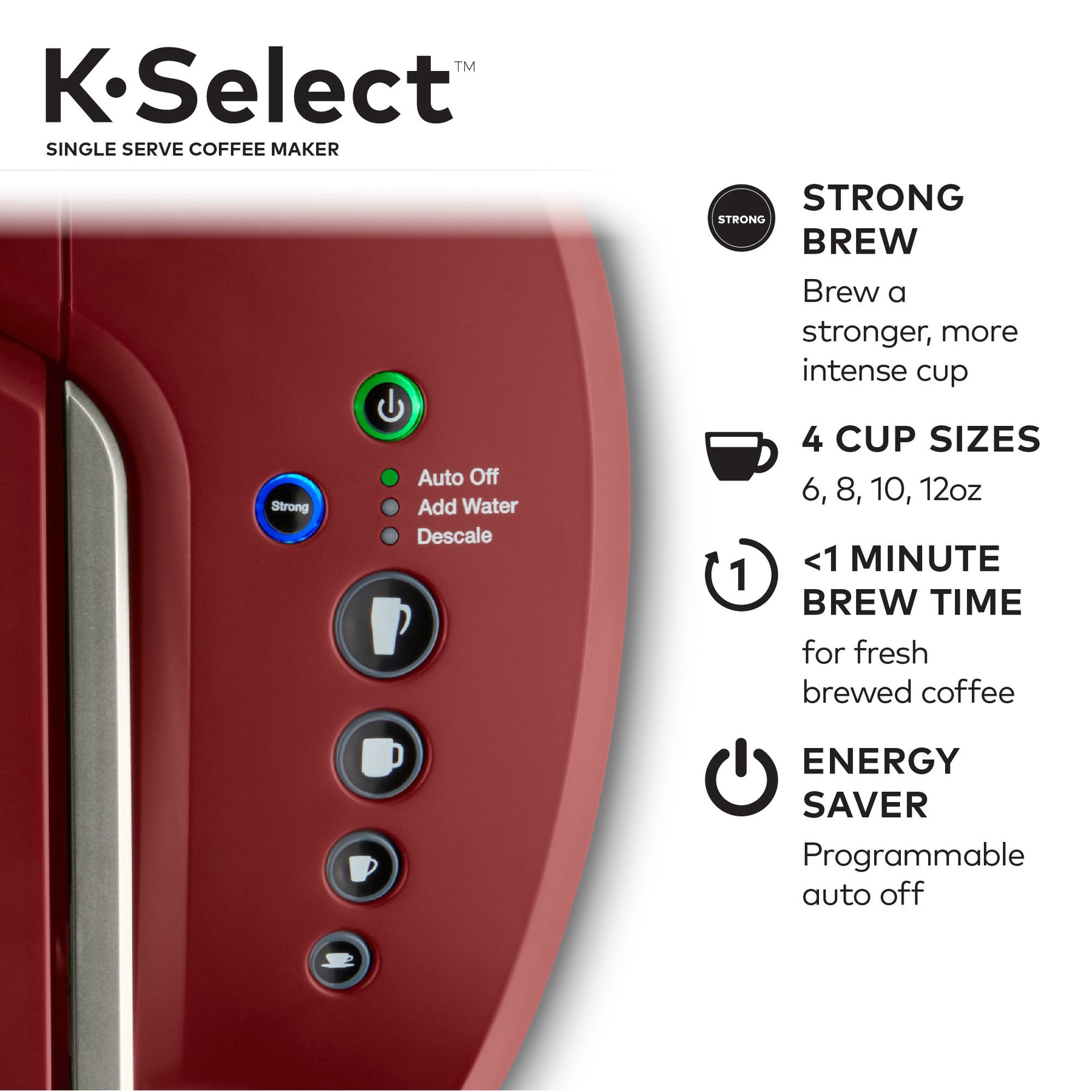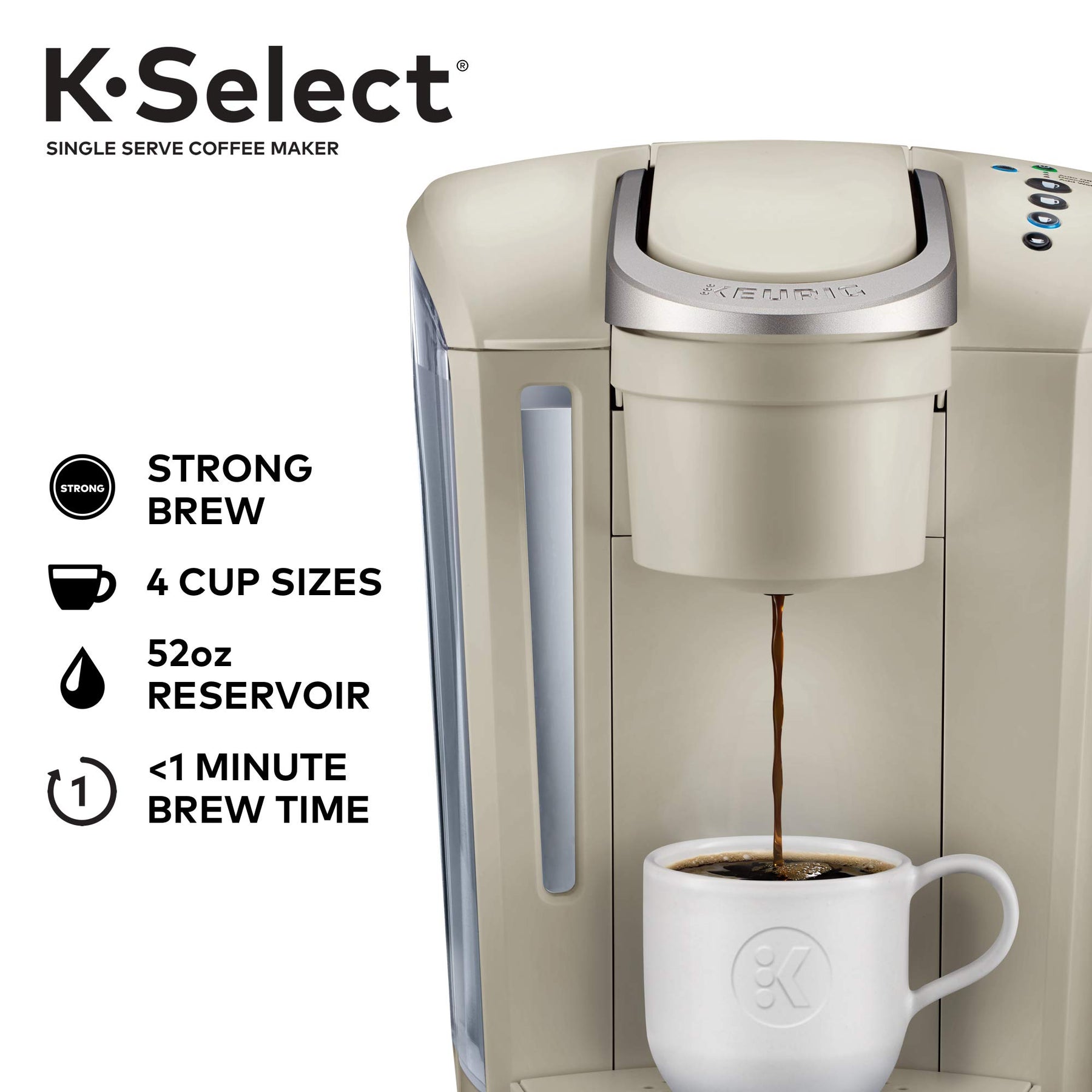 The Keurig K-Select single serve coffee maker in Matte White combines sleek design and more intuitive features to help you brew your perfect cup every single time. It features four brew sizes, so you can brew 6, 8, 10, or up to 12 oz. of your favorite coffee, tea, hot cocoa, or iced beverage with the touch of a button. And for those who like a stronger cup of coffee, the Keurig K-Select brewer is the perfect choice. The Strong Brew feature kicks up your coffee’s strength and intensity, so you can enjoy a bolder brew. Choose from hundreds of delicious varieties of K-Cup pods, or brew your own ground coffee with the My K-Cup Universal Reusable Coffee Filter (sold separately). With the K-Select brewer, you can brew 5 cups between refills of the large 52 oz. water reservoir.