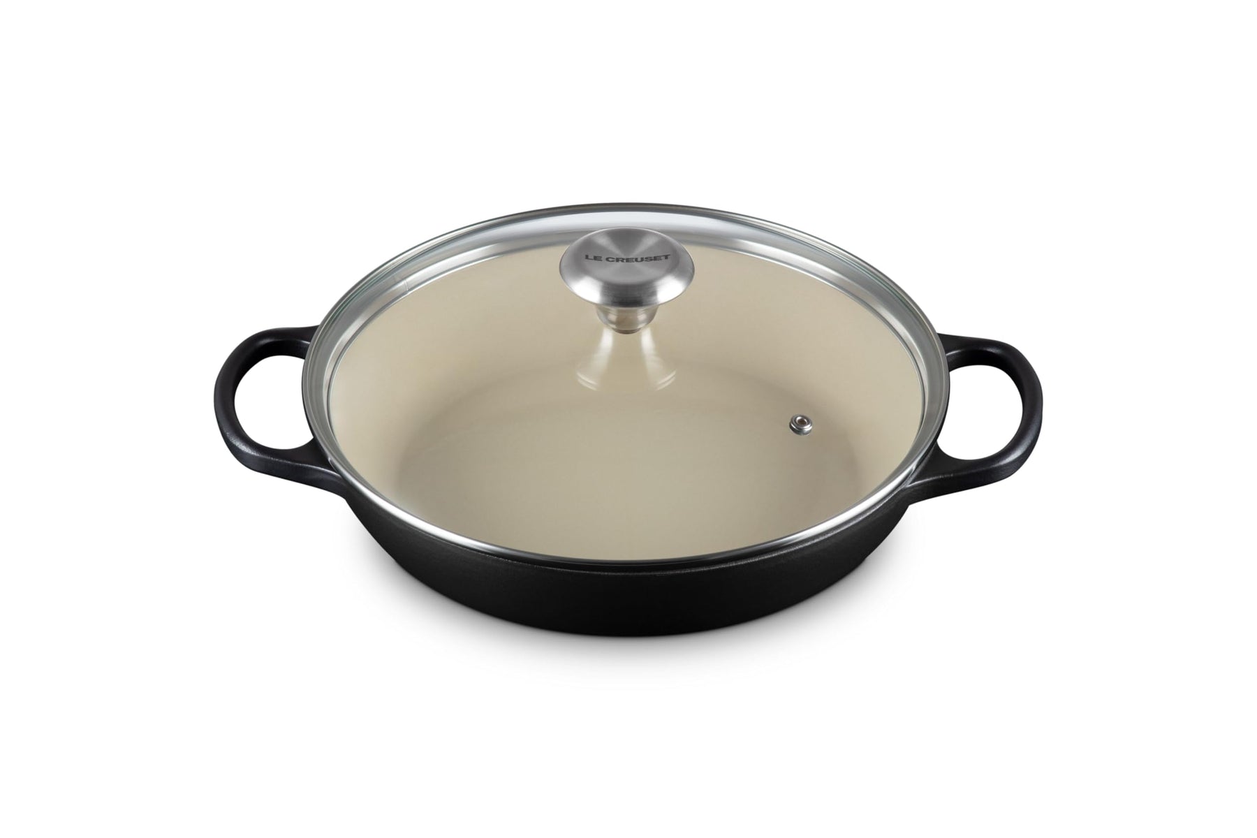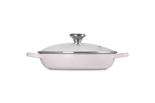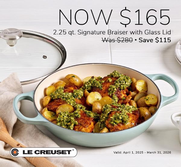 The Le Creuset Enameled Cast Iron Braiser is uniquely designed to provide steady, even heat to transform tough cuts of meat and hearty vegetables into tender, flavorful dishes. The wide base allows ingredients to be placed in a single layer for searing without crowding; once liquid is added, the tempered glass lid circulates steam to lock in moisture and flavor and allows easy monitoring of the cooking process. The versatile shape of the braiser also makes it perfect for shallow frying, steaming, casseroles and serving at the table.