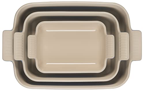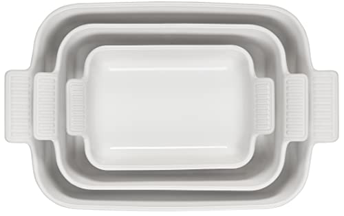 The Heritage Rectangular Baking Dish Set features three essential baking dishes needed in every kitchen, making it the perfect gift for those starting out or for refreshing an existing bakeware collection. Ideal for everything from baking rich desserts to roasting vegetables, marinating meats, storing leftovers and more, the deep sidewalls and generous capacity of the baking dish set are perfectly sized for a variety of recipes. Crafted from premium stoneware to ensure food is cooked to perfection, all of baking dishes feature a colorful glaze that is virtually nonstick for easy cleanup. Set includes one 12.5-inch dish (4 qt.), one 10-inch dish (2.5 qt.) and one 7.5” dish (1.1 qt.).