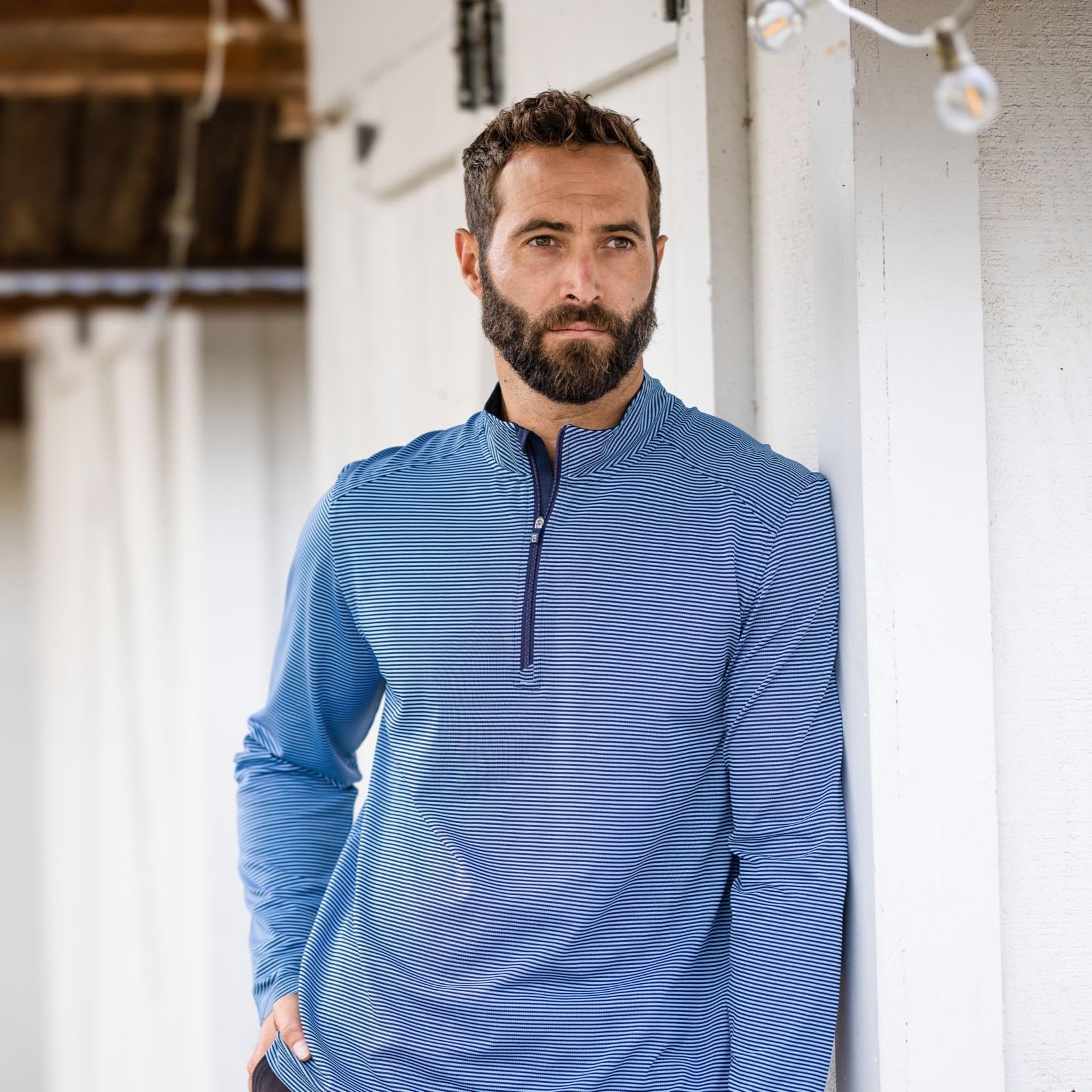 The iconic Virtue Eco Pique Micro Stripe Quarter Zip is engineered for exceptional versatility, designed as your favorite sustainable mens quarter zip for golf, the office, WFH, travel, recharging, and for a night out. Ultra-lightweight, high quality, certified eco-friendly recycled drytec polyester is blended with spandex for stretch, a cooling effect, and UPF sun protection, resulting in the most versatile, sustainable, and comfortable quarter zip for you and the planet.