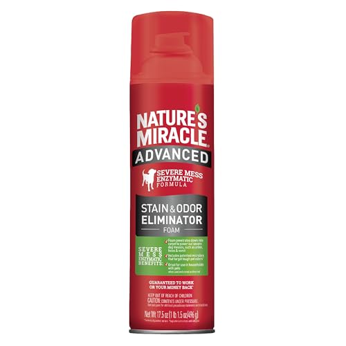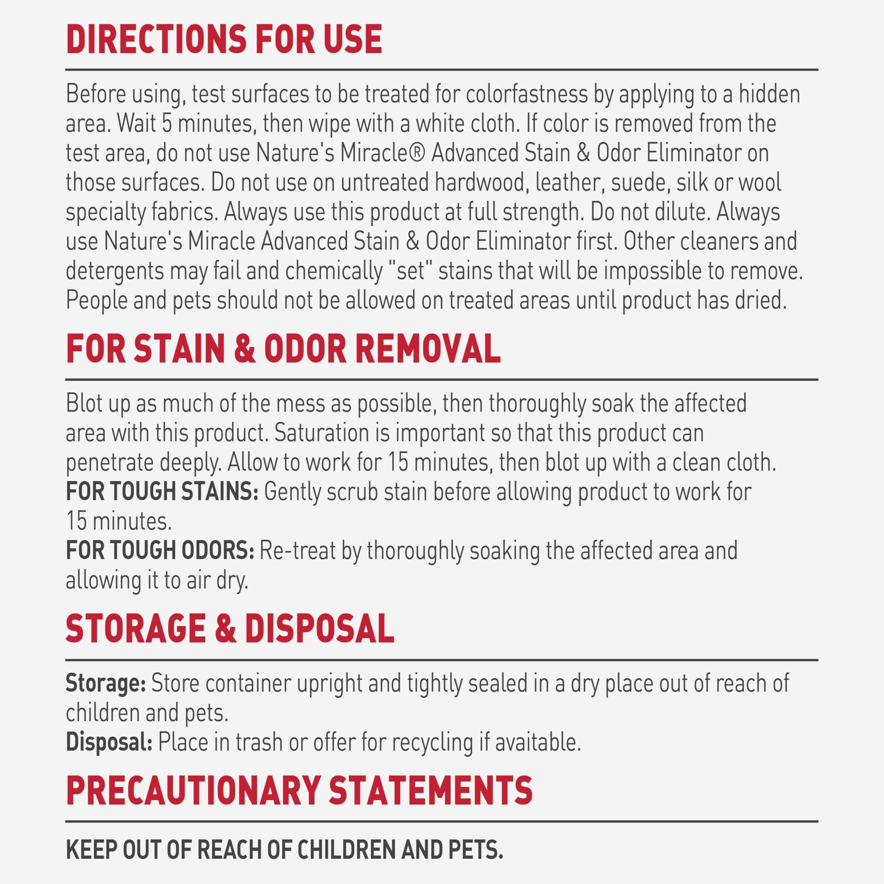 Nature’s Miracle pet stain and odor removers have been a trusted brand for pet mess cleanup for more than 35 years. Whatever pets do, you can trust Nature’s Miracle stain and odor removers, training aids, disinfectants and litter products to undo. Accidents happen, as every dog owner knows. Nature’s Miracle Advanced Stain & Odor Eliminator for dogs is an enzymatic, severe-mess stain and odor remover that actually discourages re-soiling by removing the odor of even the toughest dog messes. Bacteria-based formulas produce enzymes when they come into contact with a food source – pet urine, feces, vomit and other bio-based messes. This enzymatic cleaner continues working as long as the food source is present. Freshens with a light fresh scent. Use on carpets, hard floors, furniture, fabrics and more (see the product label for a complete list of fabrics). Do not use on untreated hardwood, leather, suede, silk or wool specialty fabrics. Always use this product at full strength. Just spray, wait 10 minutes, then blot up stain with a white cloth. When used as directed, this product is safe to use around your pets and in your home. Always use Nature’s Miracle products first. Other cleaners and detergents may fail and chemically “set” stains that will be impossible to remove.