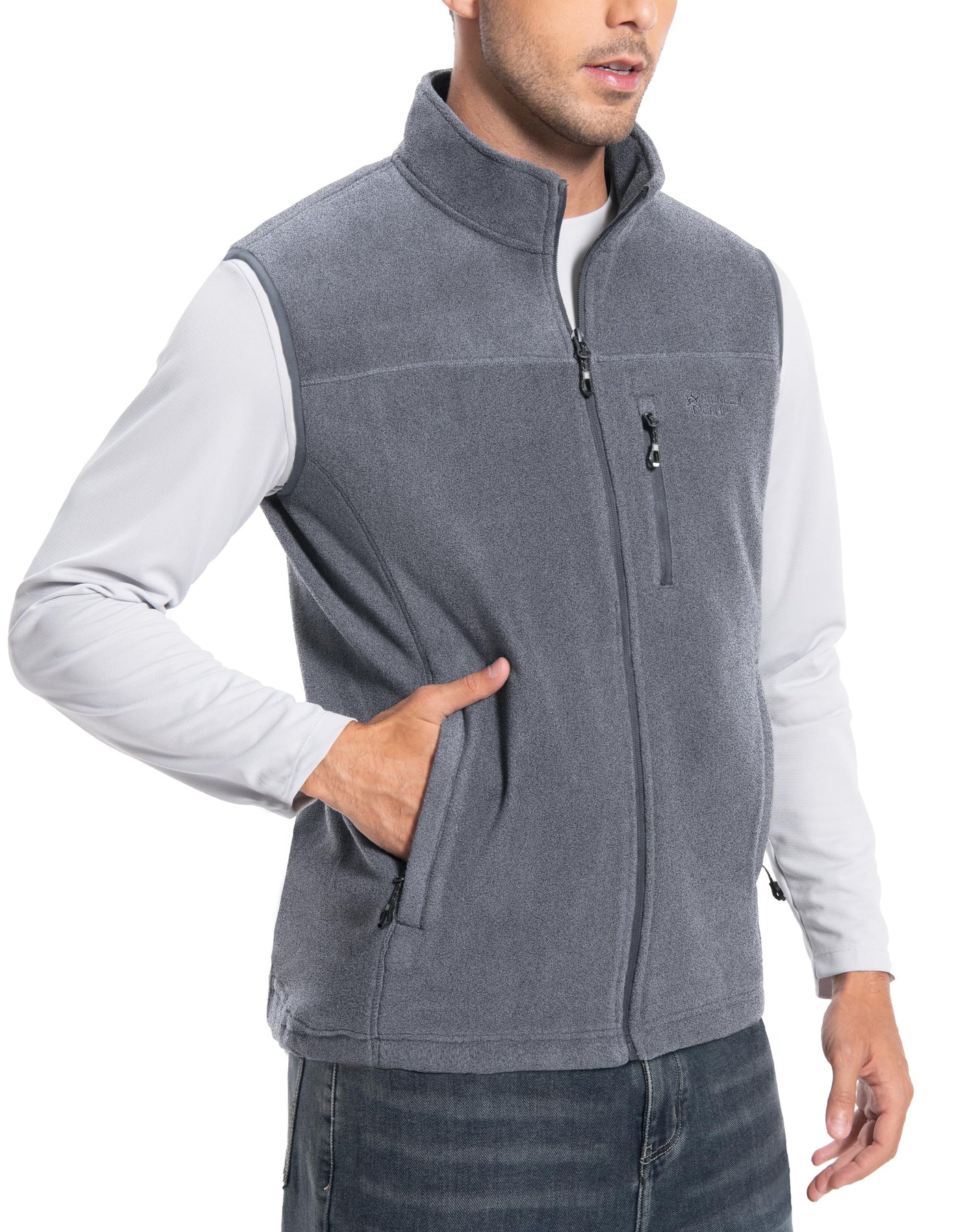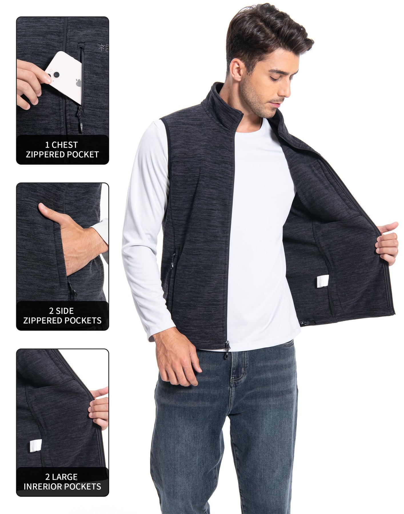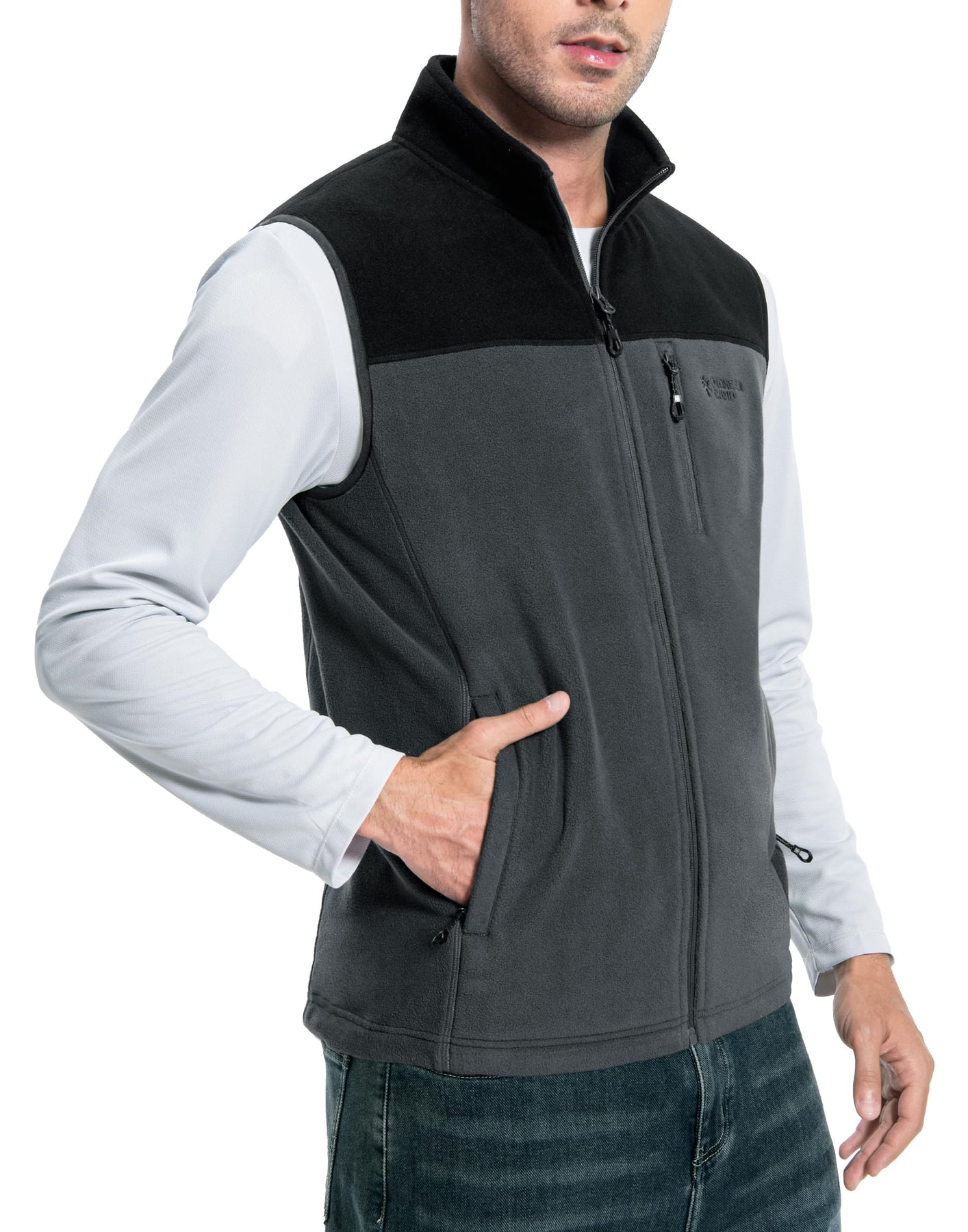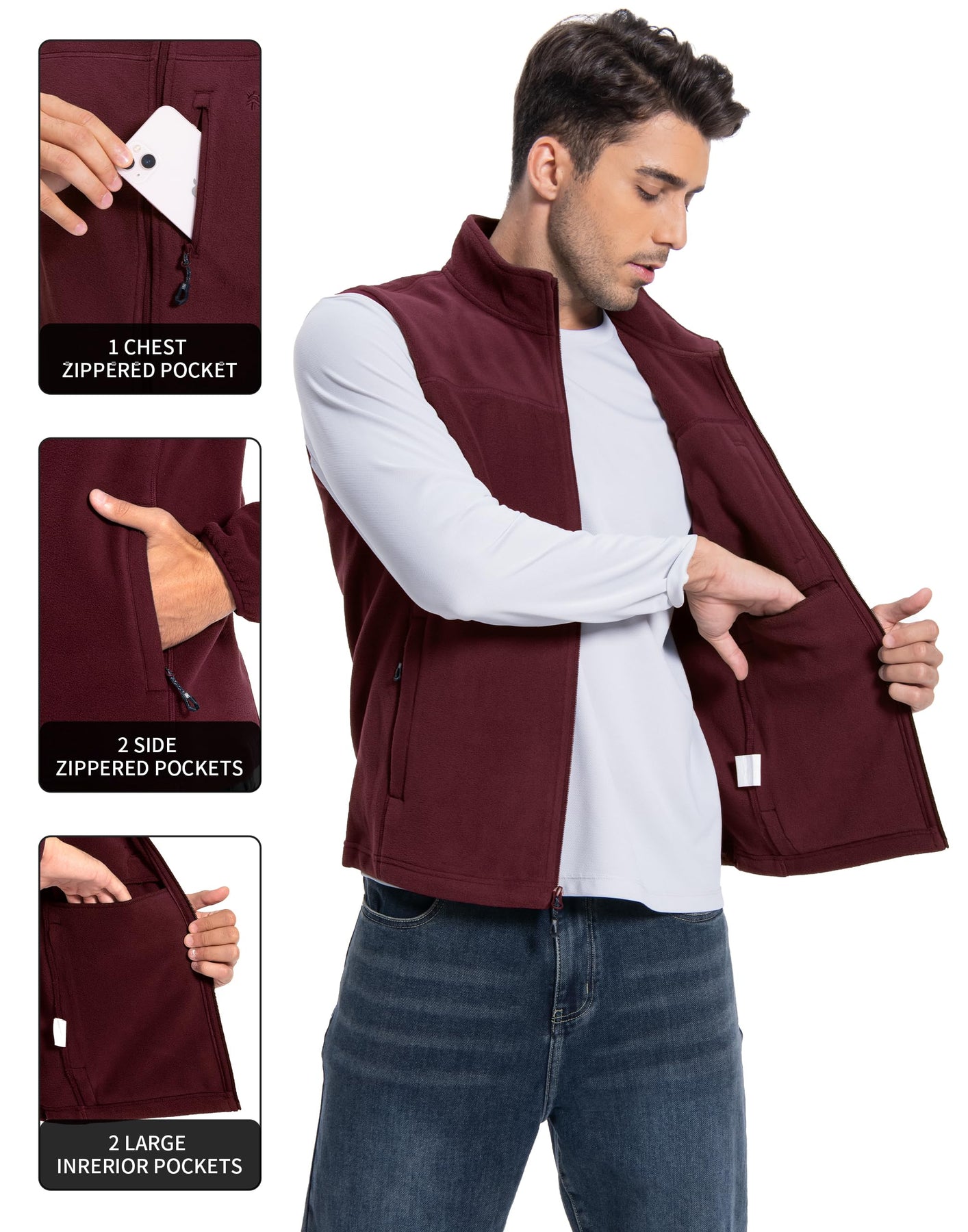 Mens Fleece Vest With 5 Pockets:This fleece vest has 2 large exterior zippered pockets for your hands and other items, 1 zippered chest pocket for smaller items, and 2 deep interior patch pockets for your cell phone, wallet, credit cards, cash, keys and more. With a collar and full zipper closure, your core will stay warm while freeing up your arms for active use.