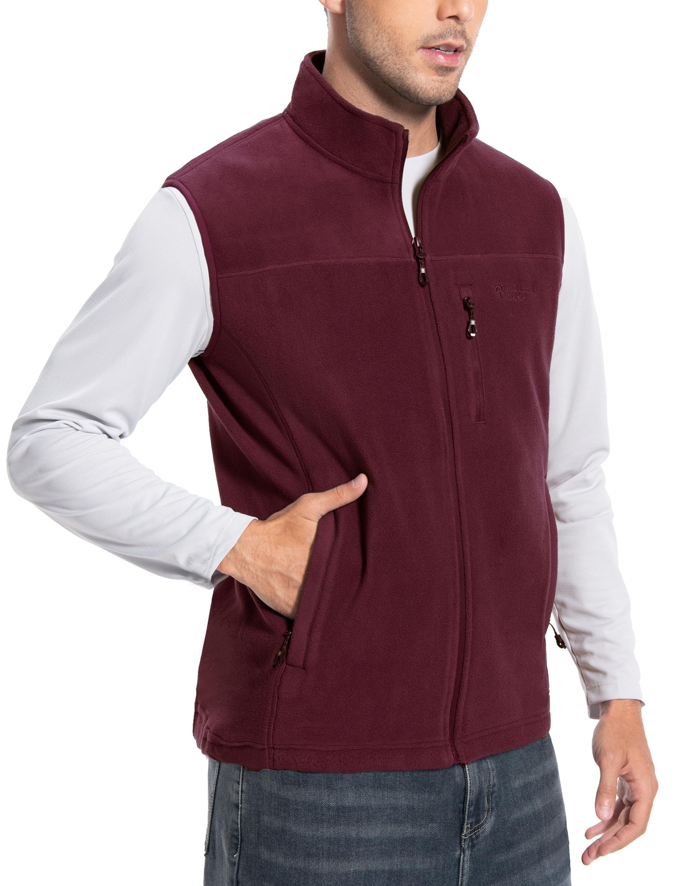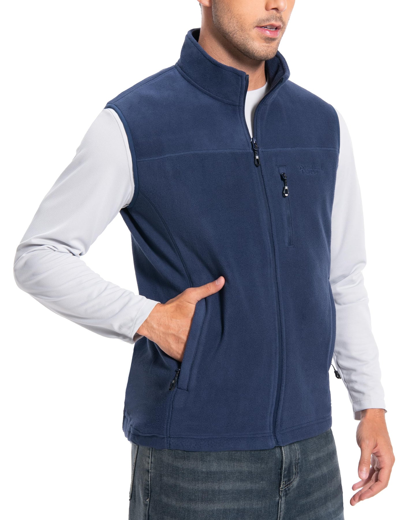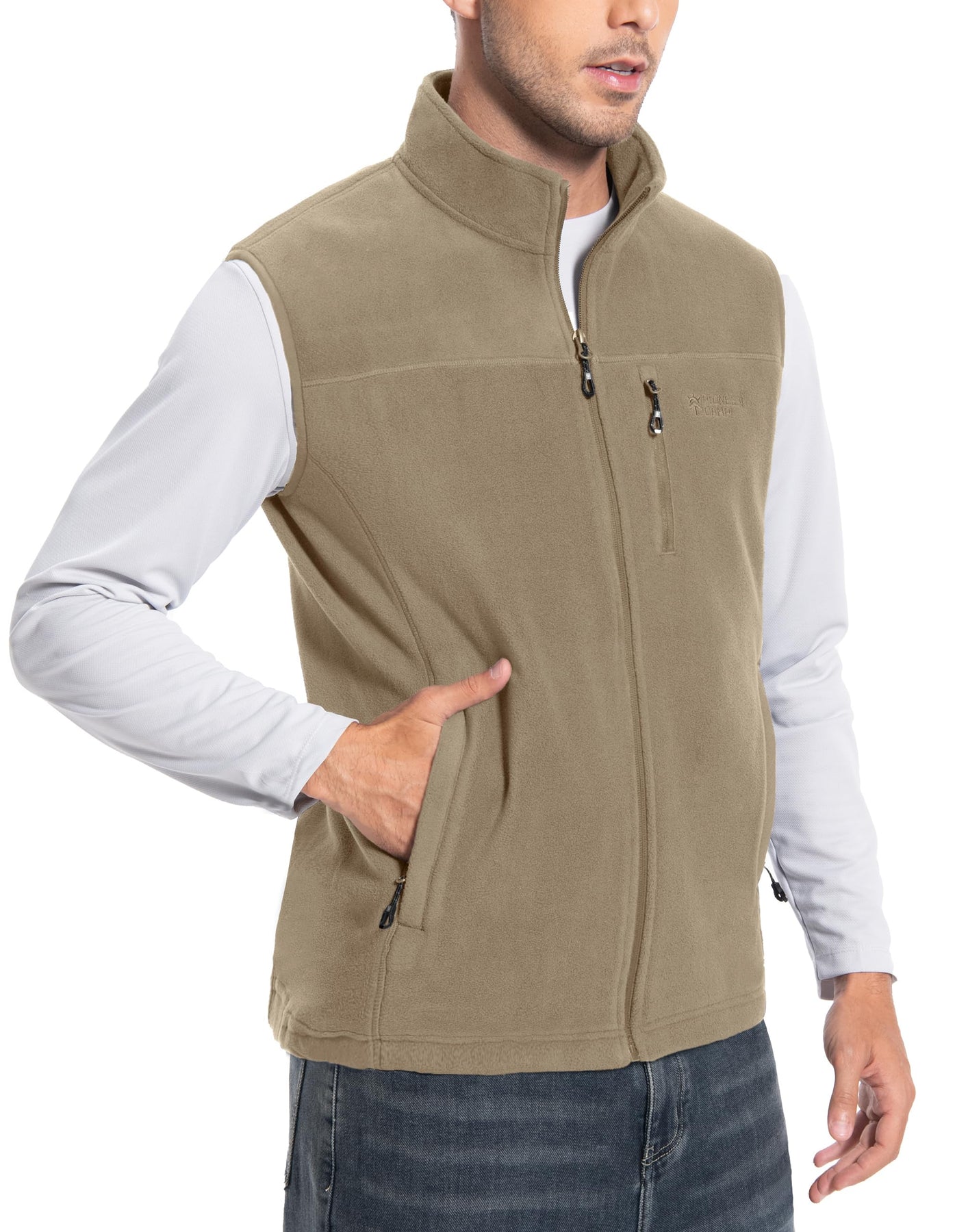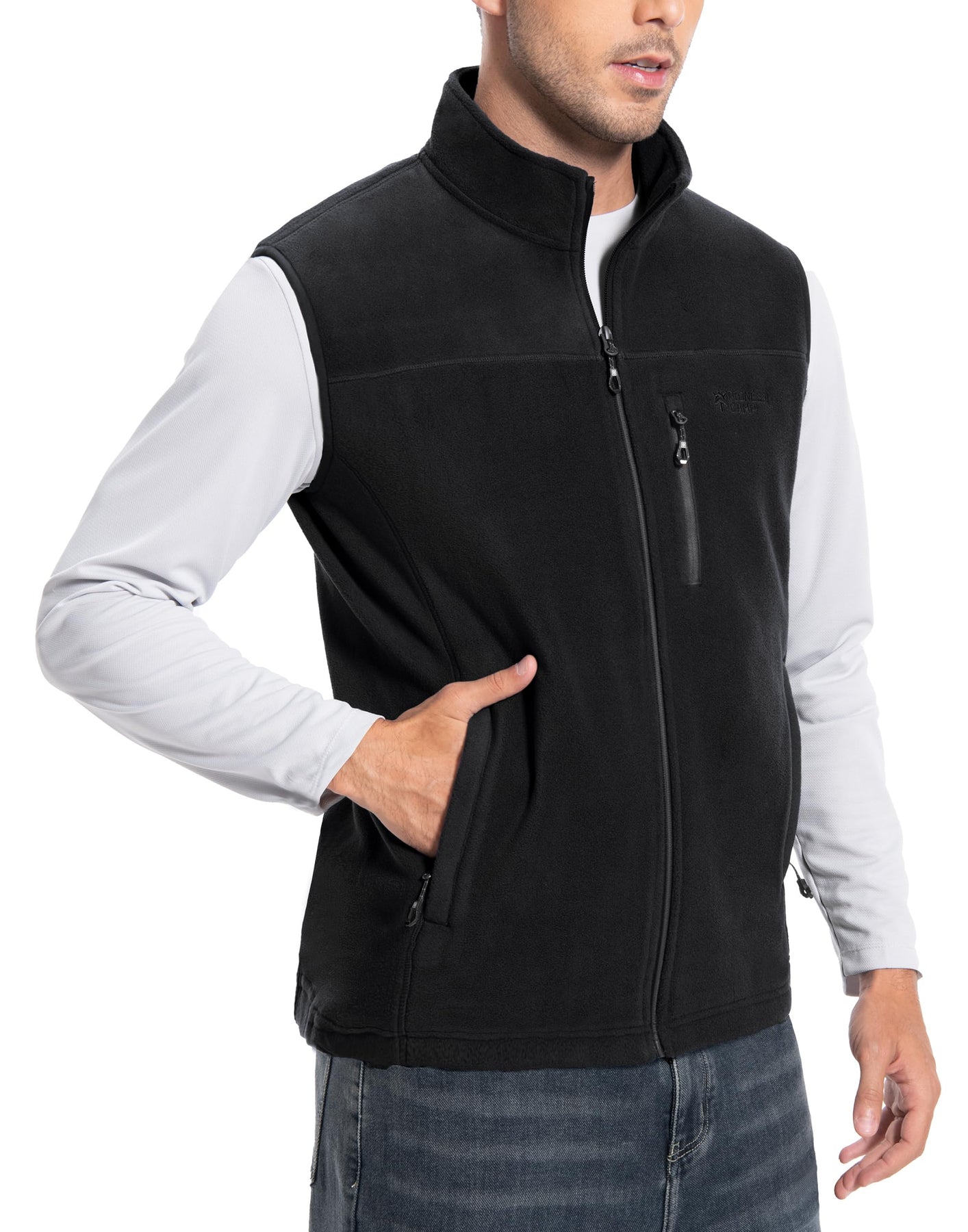 Mens Fleece Vest With 5 Pockets:This fleece vest has 2 large exterior zippered pockets for your hands and other items, 1 zippered chest pocket for smaller items, and 2 deep interior patch pockets for your cell phone, wallet, credit cards, cash, keys and more. With a collar and full zipper closure, your core will stay warm while freeing up your arms for active use.