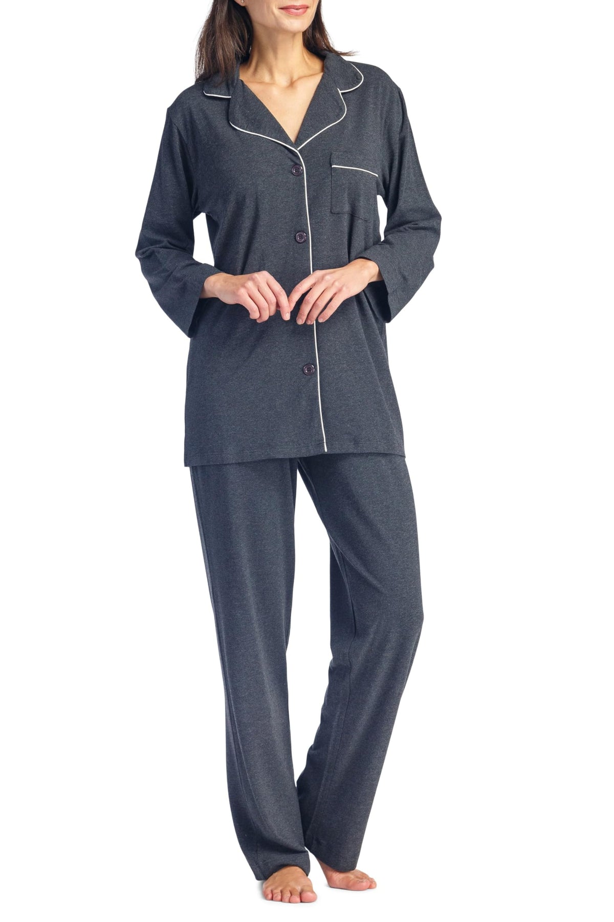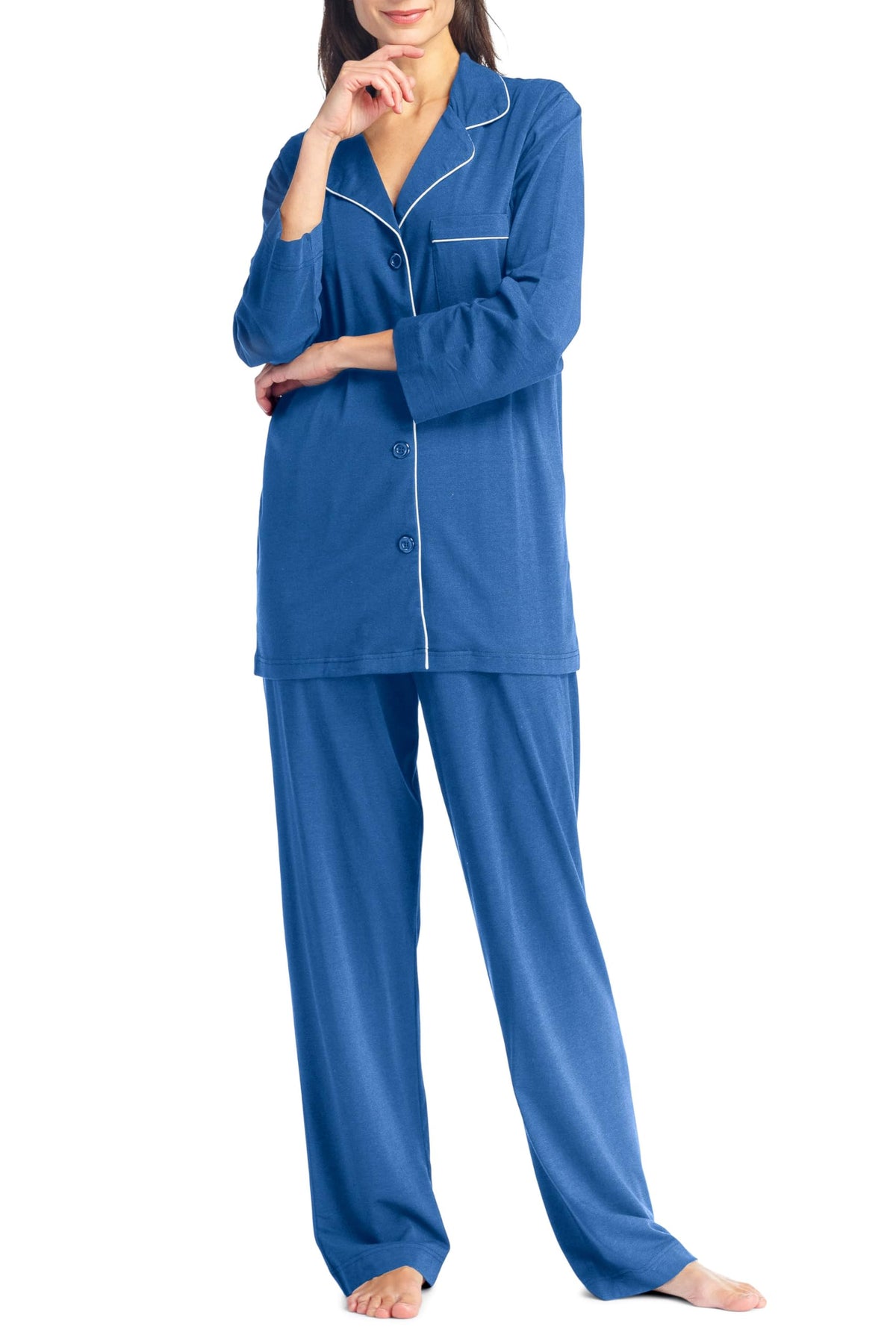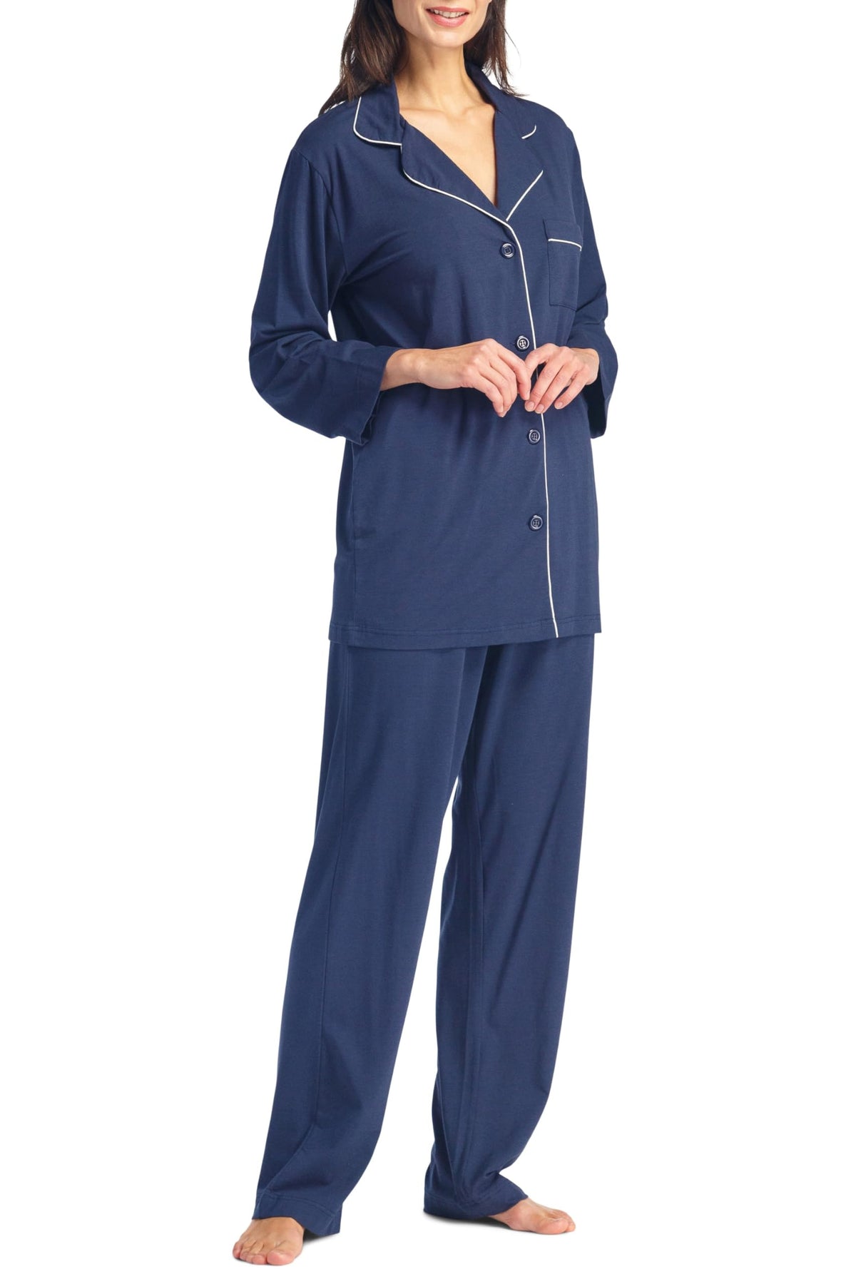 PERFECT FIT: It’s all in the details. Our long sleeve, button-front top is trimmed with white piping. A wide notched collar and relaxed fit add extra comfort. Our elastic waist full length pant brings comfort to another level. We have added an adjustable drawstring to customize fit even more.
